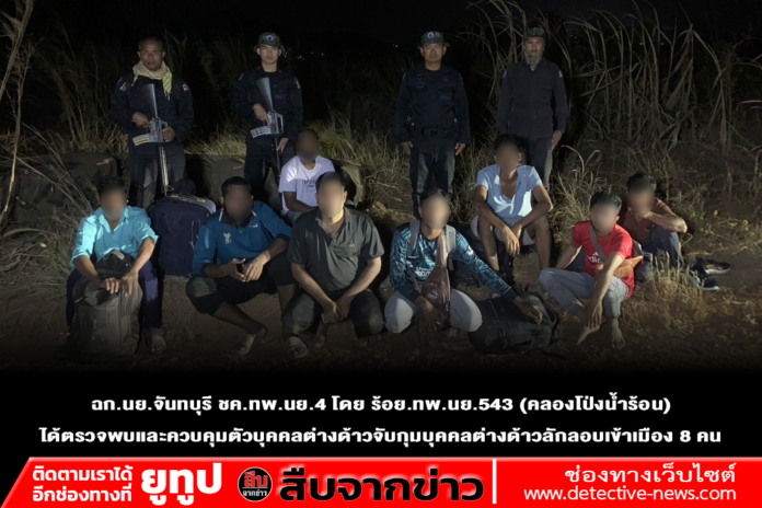 เมื่อเวลา 10 เม.ย.69 เวลา 01.30 น. กปช.จต. โดย ฉก.นย.จันทบุรี ชค.ทพ.นย.4 โดย ร้อย.ทพ.นย.543 (คลองโป่งน้ำร้อน) ได้ตรวจพบและควบคุมตัวบุคคลต่างด้าวสัญชาติบังกลาเทศ บริเวณถนนในสวนเกษตร พิกัด บ้านมะรุม หมู่ 6 ตำบลคลองใหญ่ อำเภอโป่งน้ำร้อน จังหวัดจันทบุรี จำนวน 8 คน (เพศชาย) พร้อมกระเป๋าเดินทาง