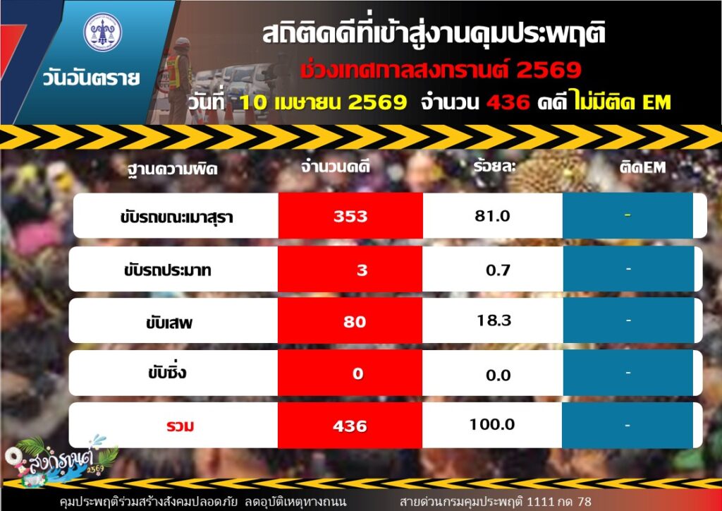 วันนี้ (11 เมษายน 2569) ร้อยตำรวจเอก ปิยะ รักสกุล อธิบดีกรมคุมประพฤติ เปิดเผยสถิติคดีที่ศาล สั่งคุมความประพฤติในวันแรก (วันที่ 10 เมษายน 2569) ของการรณรงค์ป้องกันและลดอุบัติเหตุทางถนนช่วงเทศกาลสงกรานต์ 2569 พบว่ามีคดีเข้าสู่กระบวนการคุมความประพฤติรวมทั้งสิ้น 436 คดี แบ่งเป็น คดีขับรถในขณะเมาสุรา 353 คดี คิดเป็นร้อยละ 81 คดีขับรถประมาท 3 คดี คิดเป็นร้อยละ 0.7 และคดีขับเสพ 80 คดี คิดเป็นร้อยละ 18.3