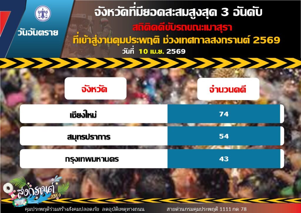 โดยจังหวัดที่มีสถิติคดีขับรถขณะเมาสุราสูงสุด 3 อันดับแรก ได้แก่ เชียงใหม่ 74 คดี สมุทรปราการ 54 คดี และกรุงเทพมหานคร 43 คดี
