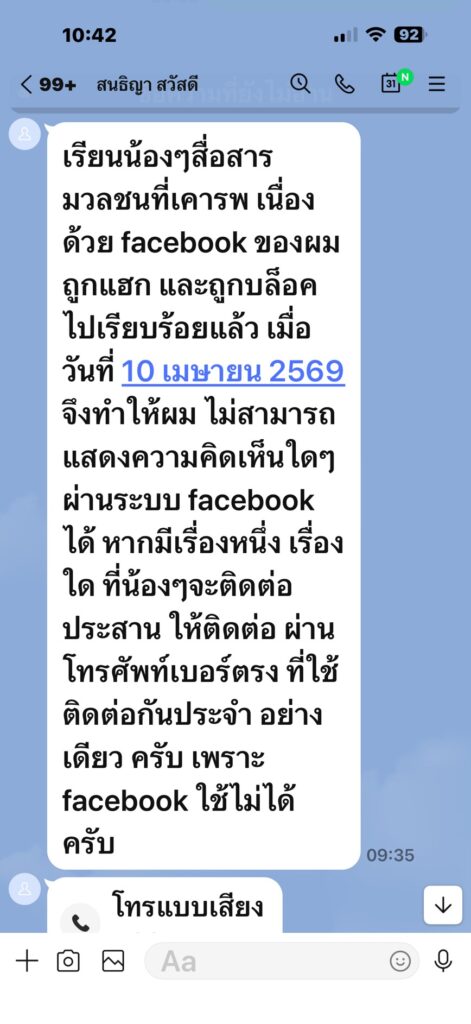 “เนื่องด้วย facebook ของผม ถูกแฮก และถูกบล็อกไปเรียบร้อยแล้ว เมื่อวันที่ 10 เมษายน 2569 จึงทำให้ผมไม่สามารถแสดงความคิดเห็นใดๆ ผ่านระบบ facebook ได้ หากมีเรื่องหนึ่งเรื่องใดที่น้องๆ จะติดต่อประสาน ให้ติดต่อผ่านโทรศัพท์เบอร์ตรงที่ใช้ติดต่อกันประจำอย่างเดียวครับ”