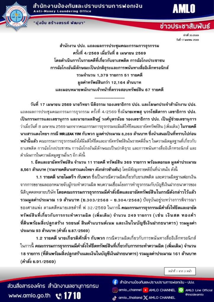 ว่าเมื่อวันที่ 8 เมษายน 2569นอกจากคณะกรรมการธุรกรรมจะมีมติให้ยึดและอายัดทรัพย์สิน (เพิ่มเติม) ในรายคดีนางสาวแตงไทยฯ กรณี MR.LEAK YIM กับพวก มูลค่าประมาณ 8,269 ล้านบาท ซึ่งนำเสนอเป็นที่ทราบไปก่อนหน้านี้แล้ว คณะกรรมการธุรกรรมยังได้มีมติให้ยึดและอายัดทรัพย์สินในรายคดีอื่นๆ ในความผิดมูลฐานที่เกี่ยวกับยาเสพติด การฉ้อโกงประชาชน การฉ้อโกงอันมีลักษณะเป็นปกติธุระ และการพนันทางสื่ออิเล็กทรอนิกส์ และดำเนินการในความผิดมูลฐานอื่นๆ อีก ดังนี้