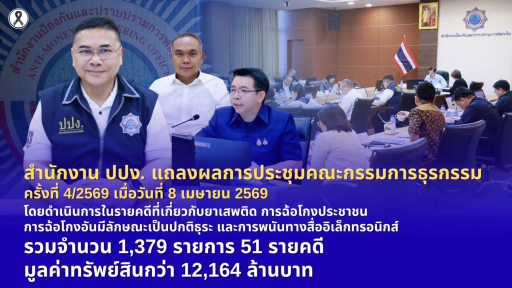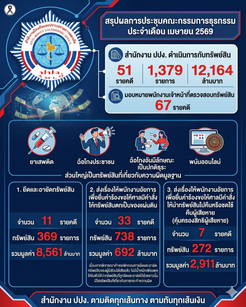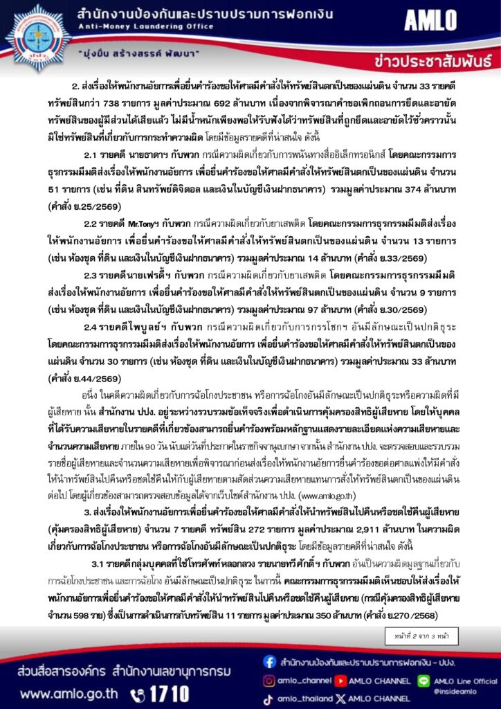 2.2 รายคดี Mr.Tonyฯ กับพวก กรณีความผิดเกี่ยวกับยาเสพติดโดยคณะกรรมการธุรกรรมมีมติส่งเรื่องให้พนักงานอัยการ เพื่อยื่นคำร้องขอให้ศาลมีคำสั่งให้ทรัพย์สินตกเป็นของแผ่นดิน จำนวน 13 รายการ (เช่น ห้องชุด ที่ดิน และเงินในบัญชีเงินฝากธนาคาร) รวมมูลค่าประมาณ 14 ล้านบาท (คำสั่ง ย.33/2569)