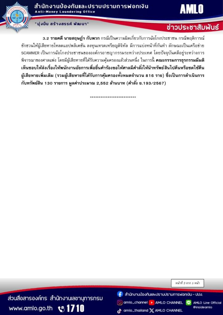 3.1 รายคดีกลุ่มบุคคลที่ใช้โทรศัพท์หลอกลวง รายนายทวีศักดิ์ฯ กับพวก อันเป็นความผิดมูลฐานเกี่ยวกับ การฉ้อโกงประชาชน และการฉ้อโกง อันมีลักษณะเป็นปกติธุระ ในการนี้คณะกรรมการธุรกรรมมีมติเห็นชอบให้ส่งเรื่องให้พนักงานอัยการเพื่อยื่นคำร้องขอให้ศาลมีคำสั่งให้นำทรัพย์สินไปคืนหรือชดใช้คืนผู้เสียหาย (กรณีคุ้มครองสิทธิผู้เสียหายจำนวน 598 ราย) ซึ่งเป็นการดำเนินการกับทรัพย์สิน11 รายการมูลค่าประมาณ 350 ล้านบาท (คำสั่ง ย.270/2568)