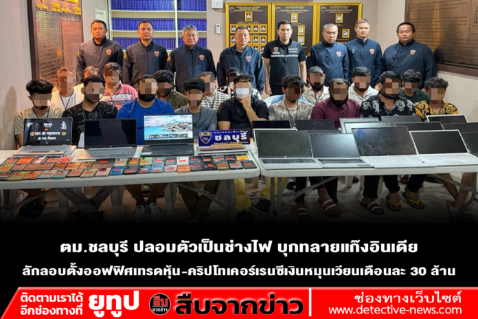 ตม.ชลบุรี ปลอมตัวเป็นช่างไฟฟ้า ปิดล้อมบ้านพักหรูย่านพัทยา รวบชาวอินเดีย 30 ชีวิต ลักลอบเปิดออฟฟิศเทรดหุ้น-คริปโทเคอร์เรนซี โดยไม่ได้รับอนุญาต พบเงินหมุนเวียนสะพัดเดือนละ 30 ล้านบาท ตำรวจเร่งขยายผลหวั่นเป็นแก๊งสแกมเมอร์หลอกเพื่อนร่วมชาติ