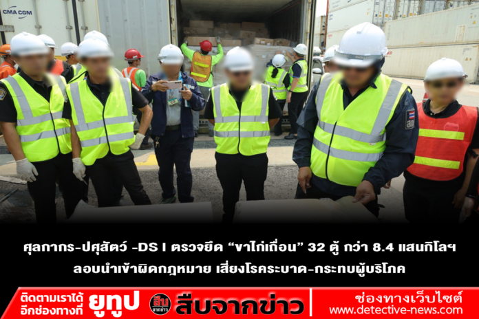 (วันนี้) วันที่ 21 เมษายน 2569 หน่วยงานภาครัฐบูรณาการกำลังเข้ม นำโดยกรมศุลกากร กรมปศุสัตว์และกรมสอบสวนคดีพิเศษ (DSI) เข้าตรวจสอบและยึดอายัดตู้คอนเทนเนอร์ต้องสงสัยบรรจุ “ขาไก่แช่แข็ง” ลักลอบนำเข้าผิดกฎหมาย รวมทั้งสิ้น 32 ตู้ น้ำหนักรวม 840,000 กิโลกรัม