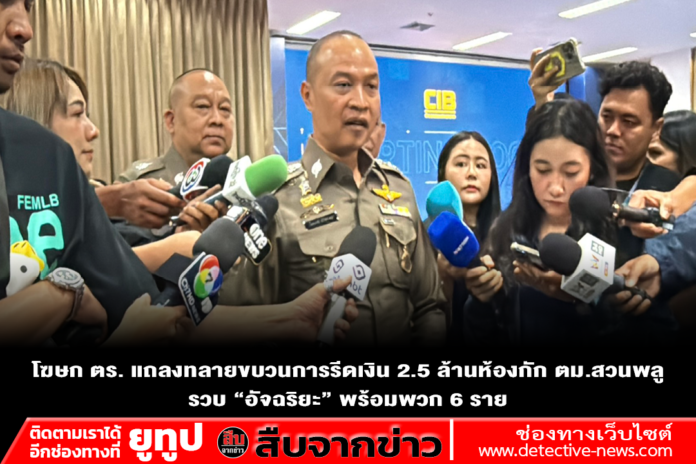โฆษก ตร. แถลงทลายขบวนการรีดเงิน 2.5 ล้านห้องกัก ตม.สวนพลู รวบ “อัจฉริยะ” พร้อมพวก 6 ราย แบ่งหน้าที่ใช้ชื่อเสียงเข้าหา-ข่มขู่-รับเงิน ผู้เสียหายถูกบีบจ่ายยังถูกแฉซ้ำ ยันดำเนินคดีตามหลักฐานไม่มีกลั่นแกล้ง ขณะสั่งลุยกวาดล้างทุจริต สั่งให้ออกราชการแล้ว 7 นาย ขยายผลทั่วประเทศ