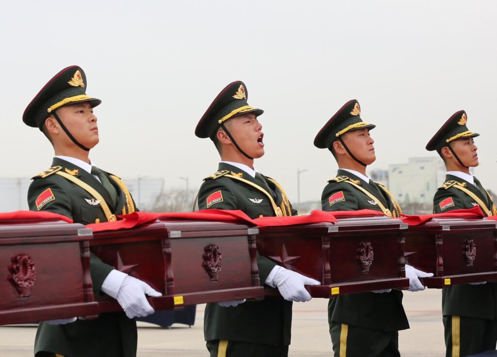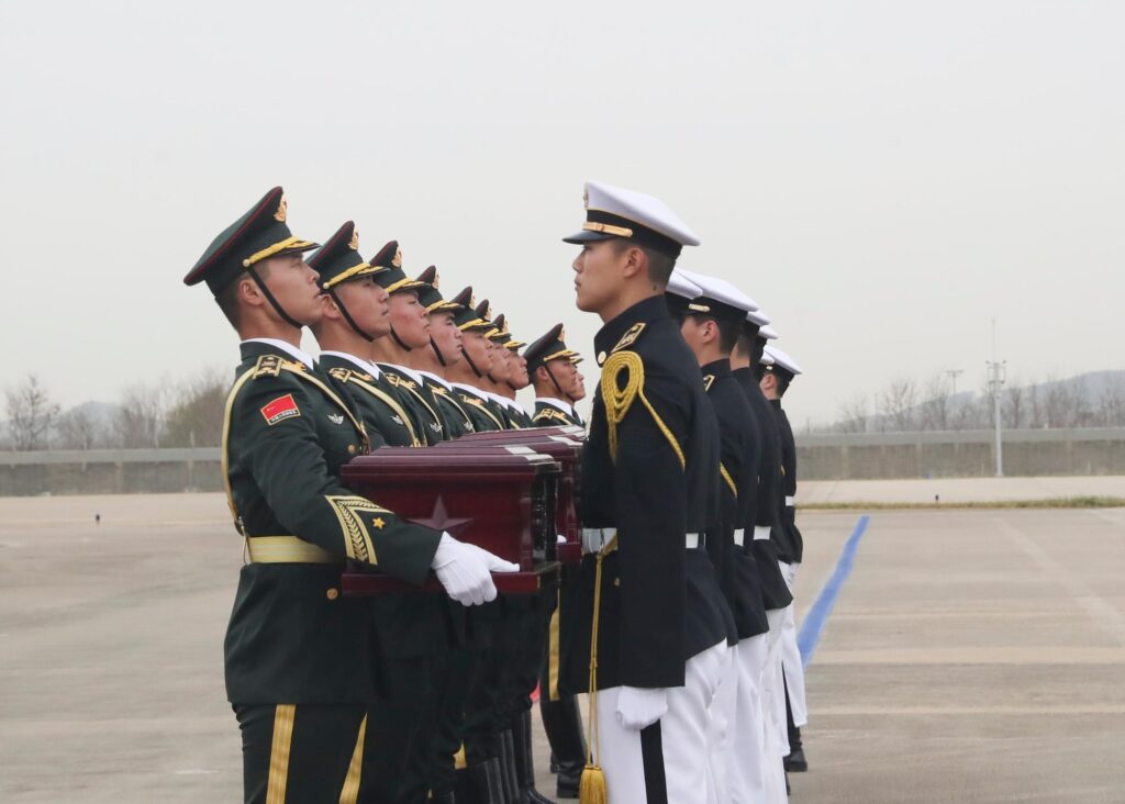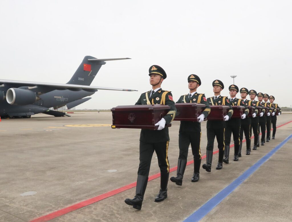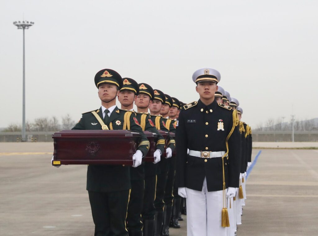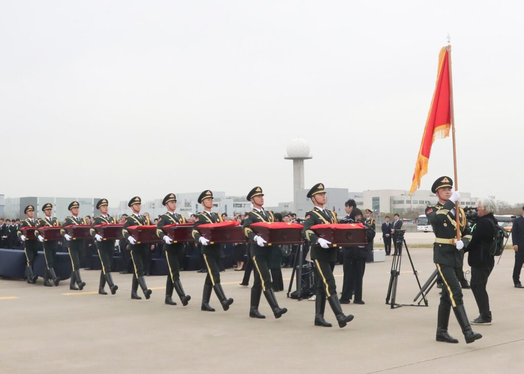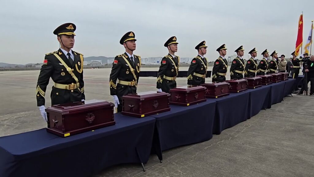 ไต้ปิง เอกอัครราชทูตจีนประจำเกาหลีใต้ เป็นผู้คลุมธงชาติจีนบนหีบศพของวีรชนผู้ล่วงลับ คณะผู้เข้าร่วมชาวจีนแสดงความเคารพด้วยการโค้งคำนับสามครั้ง และทหารกองเกียรติยศแห่งกองทัพปลดแอกประชาชนจีน (PLA) อัญเชิญหีบศพขึ้นสู่เครื่องบินขนส่งรุ่นวาย-20บี ของกองทัพอากาศจีน โดยสวีกล่าวว่าการส่งมอบครั้งนี้เป็นตัวอย่างความร่วมมือฉันมิตรระหว่างสองประเทศ ช่วยยกระดับมิตรภาพทวิภาคี และกระชับการแลกเปลี่ยนและความร่วมมือ พร้อมขอบคุณหน่วยงานที่เกี่ยวข้องและเจ้าหน้าที่ของเกาหลีใต้