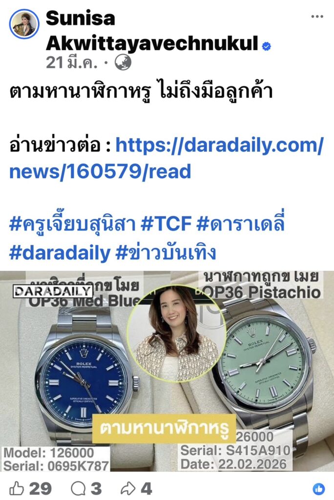 ครูเจี๊ยบระบุว่า เมื่อเดือน มี.ค.ที่ผ่านมาตนได้มีโอกาสพูดคุยกับหนึ่งในผู้เสียหายรายใหญ่ที่ได้รับความเดือดร้อนจากการสั่งพรีออเดอร์นาฬิกาหรูแต่ไม่ได้รับของ ซึ่งภายหลังสืบทราบว่าทางร้านได้นำนาฬิกาเรือนดังกล่าวไปจำนำเพื่อนำเงินมาหมุนเวียน