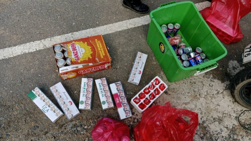 รายที่ 2 นางทิม อัม อายุ 40 ปี พร้อมของกลาง ได้แก่ บุหรี่ LUXURY จำนวน 2 แท่ง, บุหรี่ GOLD SEAL จำนวน 3 แท่ง, บุหรี่ FINE จำนวน 1 แท่ง, บุหรี่ IZA จำนวน 1 แท่ง, สุราแช่ (เบียร์) จำนวน 2 แพ็ค, เครื่องดื่ม BOOSTRONG จำนวน 18 กระป๋อง และเครื่องดื่ม DAZZ จำนวน 24 กระป๋อง