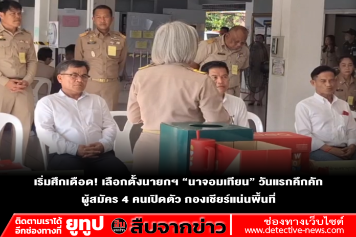วันนี้ (27 เม.ย. 2569) บรรยากาศการเปิดรับสมัครเลือกตั้งนายกเทศมนตรีตำบลนาจอมเทียน ณ อาคารศูนย์ดำรงธรรม ชั้น 4 เทศบาลตำบลนาจอมเทียน เป็นไปอย่างคึกคักตั้งแต่ช่วงเช้า ผู้สมัครทั้ง 4 คน เดินทางมาพร้อมทีมงานและกองเชียร์ที่หลั่งไหลมาให้กำลังใจกันอย่างล้นหลาม สร้างสีสันและความตื่นตัวให้กับการเมืองท้องถิ่นตั้งแต่วันแรก