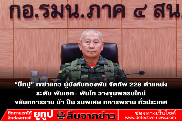 “บิ๊กปู” เขย่าแถว ผู้บังคับกองพัน จัดทัพ 228 ตำแหน่ง ระดับ พันเอก- พันโท วางขุนพลรบใหม่ ขยับทหารราบ ม้า ปืน รบพิเศษ ทหารพราน ทั่วประเทศ รับศึกชายแดนเดือด วางผู้พันทหารเสือ ทหารอีสาน ชายแดนใต้ สลับกำลังระอุ