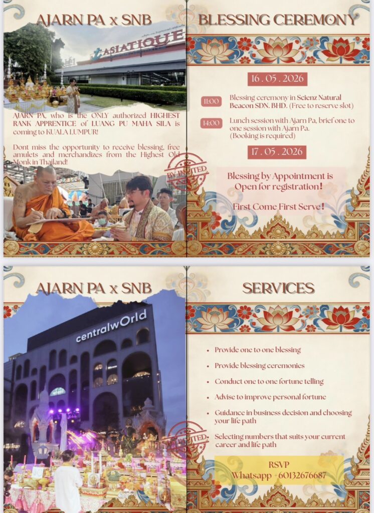 – เวลา 11:00 น. พิธีเจริญพระพุทธมนต์และอำนวยพร ณ Scienz Natural Beacon SDN. BHD. (เข้าร่วมฟรีตามโควต้าที่กำหนด)