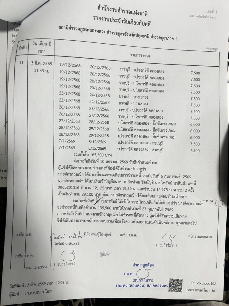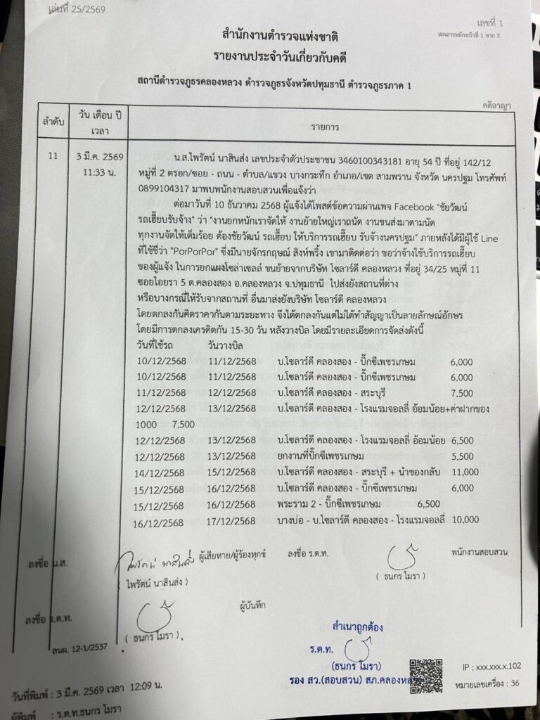แม่รัตน์และลูกสาว หนึ่งในผู้เสียหายเปิดเผยว่า ตนประกอบอาชีพรับจ้างขนส่งรถเฮี๊ยบ ขนย้ายสินค้า ยิงแอดฯ ทางกลูเกิ้ล มีลูกค้าติดต่อว่าจ้างงานเรื่อยๆ เมื่อเดือน ธ.ค.68 มีบริษัทยักษ์ใหญ่ด้านโซลาเซลส์ รับติดตั้งทั่วประเทศ ได้ติดต่อว่าจ้างให้ไปรับงานขนส่งจากคลองสอง ปทุมธานี ไปส่งที่ จ.ราชบุรี / สระบุรี จำนวนหลายครั้ง แต่จ่ายเงินค่าขนส่งไม่ครบตามที่ตกลง รวมค่าจ้างประมาณ 3 แสน แต่จ่ายมาจริงแค่ 3 หมื่นบาทเท่านั้น แจ้งความไว้ที่ สภ.คลองหลวง ปทุมธานี ตั้งแต่ มีนาคม จนบัดนี้ก็ยังไม่มีความคืบหน้าแต่อย่างใด