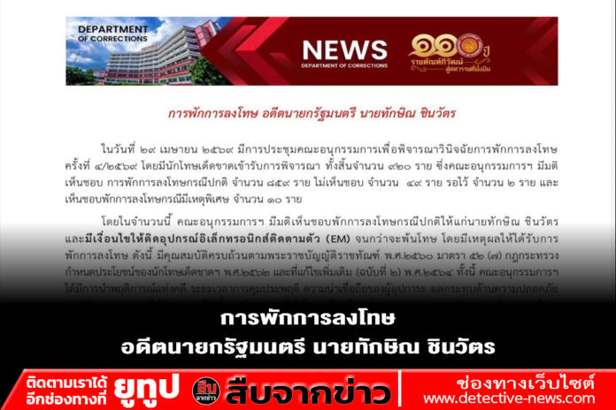 โดยในจำนวนนี้ คณะอนุกรรมการฯ มีมติเห็นชอบพักการลงโทษกรณีปกติให้แก่นายทักษิณ ชินวัตร และมีเงื่อนไขให้ติดอุปกรณ์อิเล็กทรอนิกส์ติดตามตัว (EM) จนกว่าจะพ้นโทษ โดยมีเหตุผลให้ได้รับการพักการลงโทษ ดังนี้ มีคุณสมบัติครบถ้วนตามพระราชบัญญัติราชทัณฑ์ พ.ศ.๒๕๖๐ มาตรา ๕๒ (7) กฎกระทรวงฯ กำหนดประโยชน์ของนักโทษเด็ดขาดฯ พ.ศ.๒๕๖๒ และที่แก้ไขเพิ่มเติม (ฉบับที่ ๒) พ.ศ.๒๕๖๔ ทั้งนี้ คณะอนุกรรมการฯ ได้มีการนำพฤติการณ์แห่งคดี ระยะเวลาการคุมประพฤติ ความน่าเชื่อถือของผู้อุปการะ ผลกระทบด้านความปลอดภัยของสังคม และการได้รับการแก้ไขฟื้นฟูพัฒนาพฤตินิสัยภายในเรือนจำ มาประกอบการพิจารณาพักการลงโทษ ประกอบกับมีเหตุผลพิเศษสนับสนุนการใช้ดุลยพินิจพิจารณาสามารถผ่อนปรนให้ได้รับการพักการลงโทษด้วยเหตุผล มีอายุตั้งแต่ ๗๐ ปีขึ้นไป เหลือโทษจำต่อไปไม่เกิน ๑ ปี ผ่านการแก้ไขฟื้นฟูและพัฒนาพฤตินิสัยจนน่าเชื่อว่าสามารถปรับเปลี่ยนทัศนคติและพฤติกรรมไปในทางที่ดีขึ้น และมีผลการประเมินตามแบบประเมินความเสี่ยงในการกระทำผิดซ้ำ มีความเสี่ยงค่อนข้างน้อย ซึ่งนายทักษิณฯ จะเข้าเกณฑ์การพักการลงโทษกรณีปกติในวันที่ ๑๐ พฤษภาคม ๒๕๖๙ และสามารถปล่อยตัวคุมประพฤติได้ตั้งแต่วันที่ ๑๑ พฤษภาคม ๒๕๖๙ เป็นต้นไป