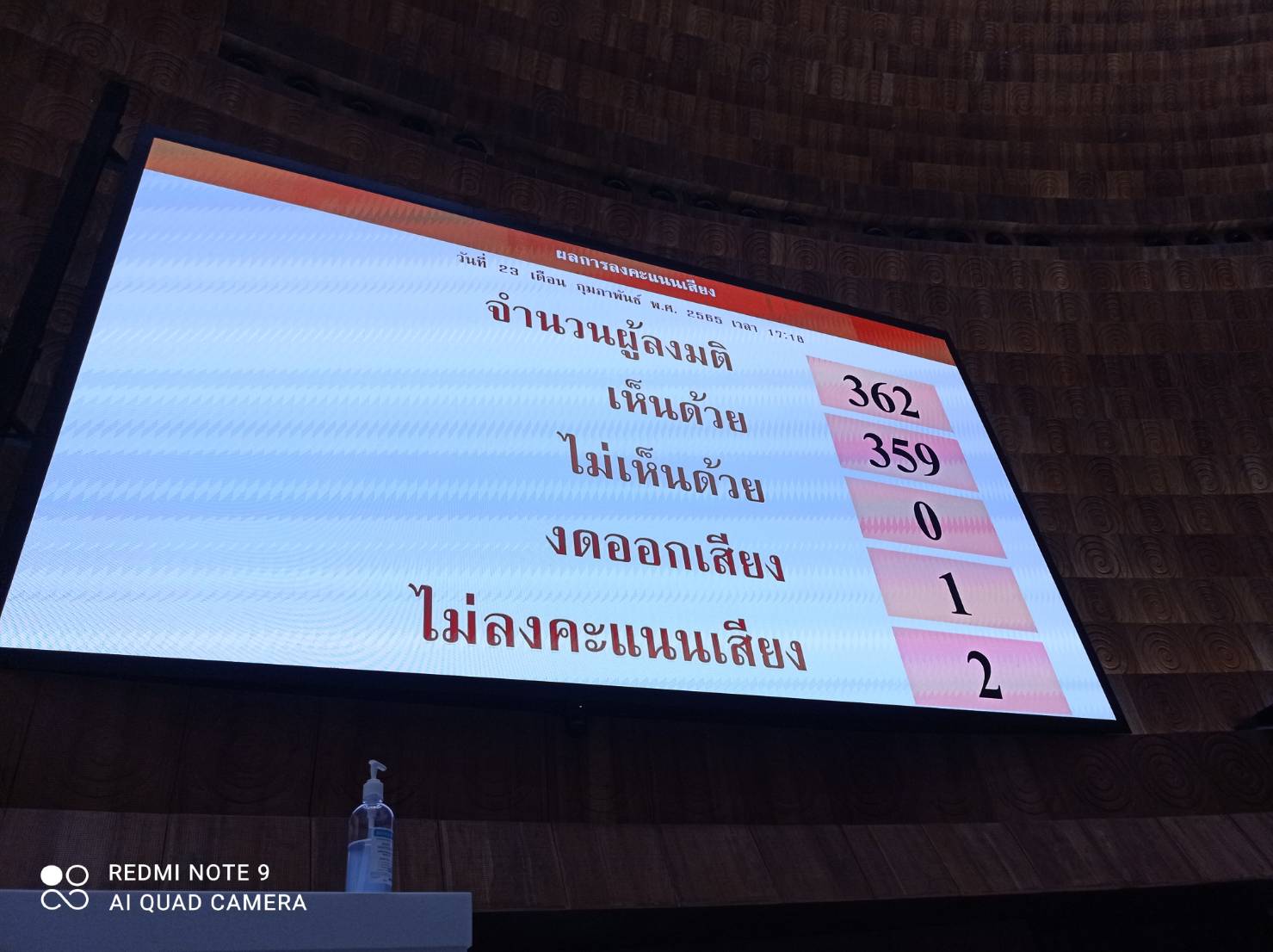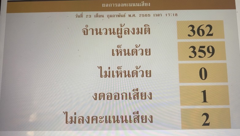กระทั่ง เวลา 17.20 น. หลังสมาชิกอภิปรายเป็นรายมาตราเสร็จสิ้นแล้ว ที่ประชุมมติในวาระสาม เห็นชอบกับร่าง พ.ร.บ.ดังกล่าวด้วยคะแนน 359 เสียง ไม่เห็นด้วยไม่มี งดออกเสียง 1 เสียง ไม่ลงคะแนน 2 เสียง ซึ่งขั้นตอนจากต่อไปทางสภาฯ จะส่งให้วุฒิสภาพิจารณาต่อไป